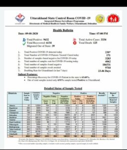 Uttarakhand उत्तराखंड में कोरोना के 230 नए मामले By ckitadmin - August 9, 2020 0 181 Share on Facebook Tweet on Twitter उत्तराखंड में कोरोना के 230 नए मामले सामने आए जिसके बाद राज्य में कोरोना का आकड़ा 9632 तक पहुँच गया है इसके साथ ही 8 और लोगो की मौत के बाद कोरोना से मरने वाले का आकड़ा 125 होगया है जिसमे एम्स मे 3 लोगों की जान गई है।
