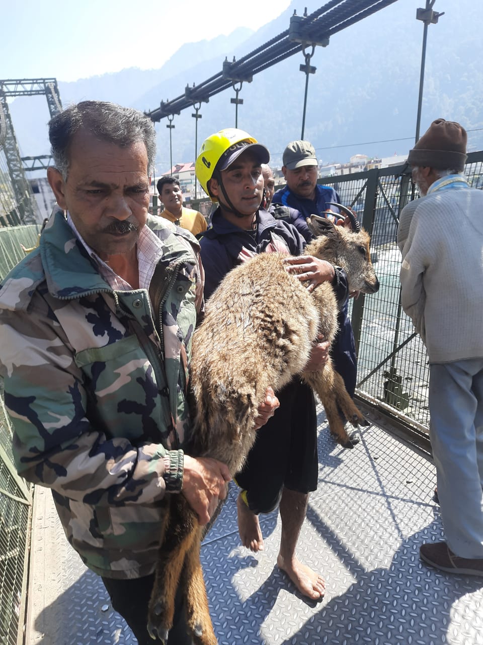 जहां SDRF को सूचना प्राप्त हुई कि उत्तरकाशी के मणिकर्णिका घाट के पास एक हिरण का बच्चा भागीरथी की तेज लहरों की चपेट में आने से बहते हुए नदी के बीच बने टापू पर फंस गया है।