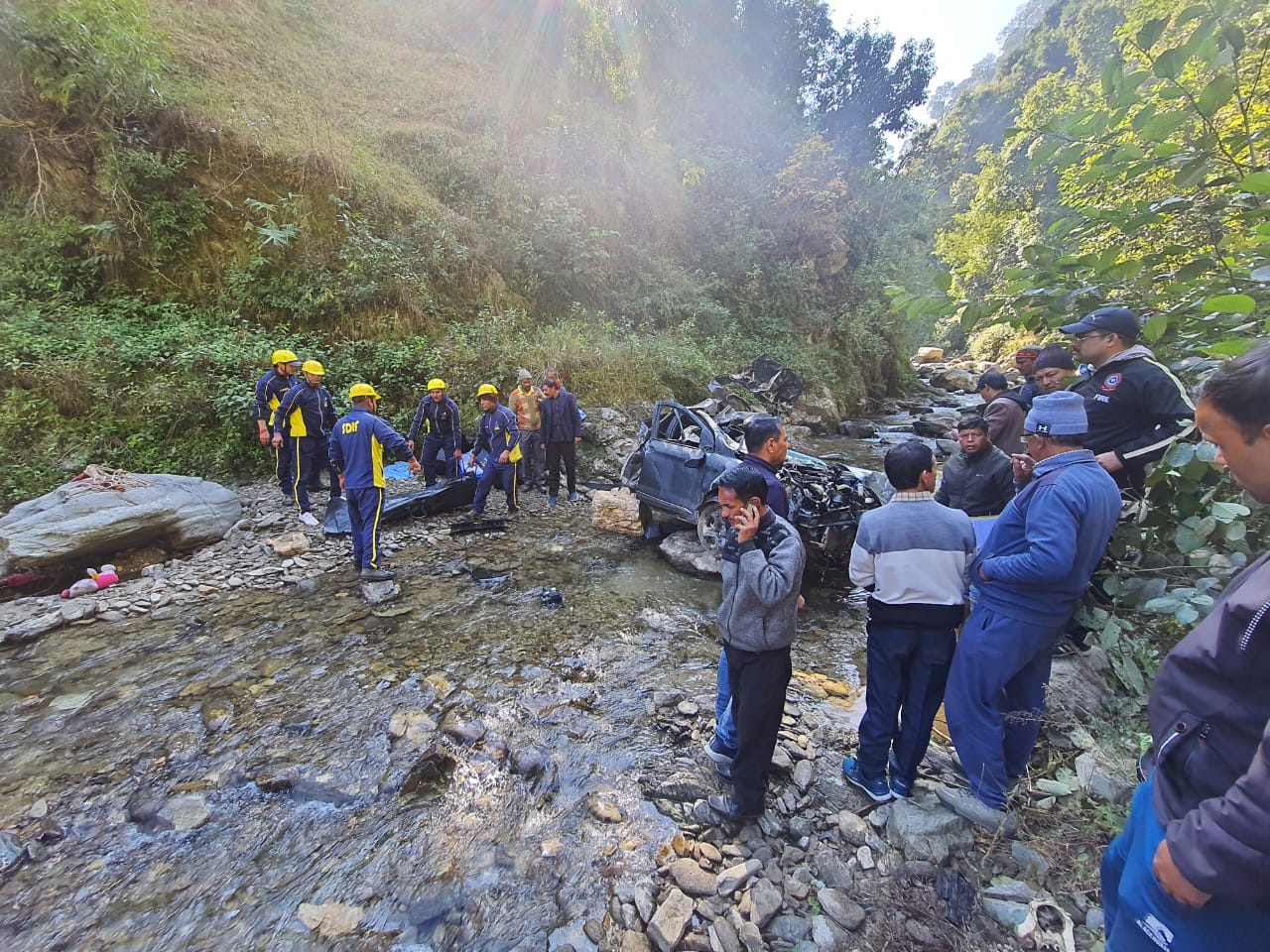 घटनास्थल पर टीम द्वारा देखा गया कि उक्त वाहन फोर्ड फिएस्टा(वाहन संख्या UK 18H 6578) था,जो सड़क से 100 मीटर नीचे खाई में गिर गया था। वाहन में सात लोग सवार बताए जा रहे है ,जिनमे से तीन को घायल अवस्था मे रेस्क्यू कर अस्पताल पहुंचाया गया व एसडीआरएफ टीम द्वारा 4 शवों को खाई से बरामद कर मुख्य मार्ग तक लाकर राजस्व पुलिस के सुपुर्द किया गया।