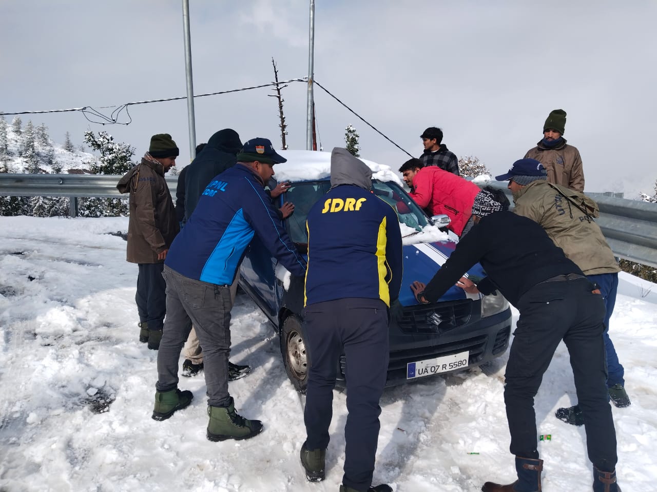 DEHRADUN:आज जनपद देहरादून के थाना चकराता द्वारा SDRF को सूचित किया गया कि त्यूणी मोटर मार्ग पर चकराता से लगभग 12 किलोमीटर आगे एक वाहन बर्फबारी से बाधित हुए मार्ग में फंसा हुआ है जो फिसलन के कारण निकल नही पा रहा है।