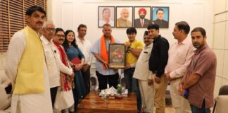 केदार फिल्म के अभिनेता देवा धामी और उनकी टीम ने फिल्म का पोस्टर मंत्री जोशी को किया भेंट